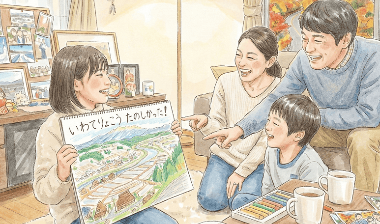 帰宅後:「信さんの宿題」として、旅の思い出を絵や文章などで自由に表現し、学びを振り返ります。